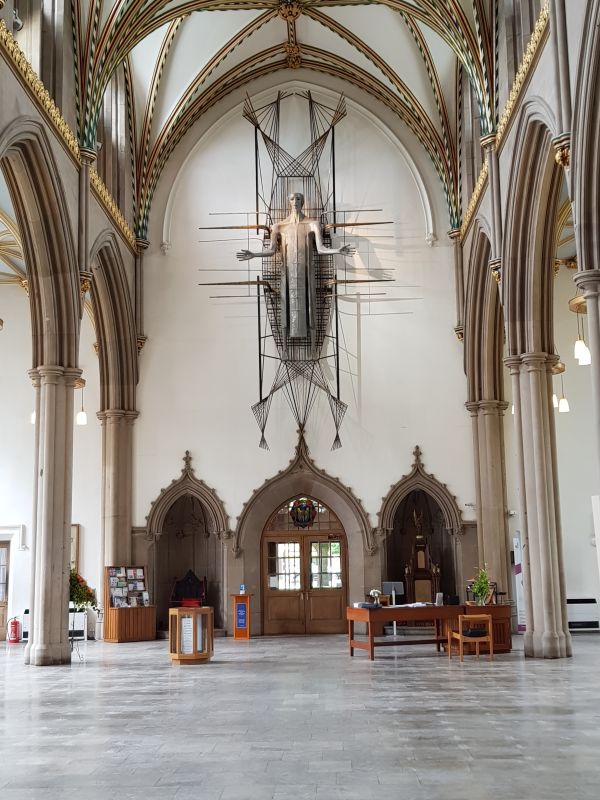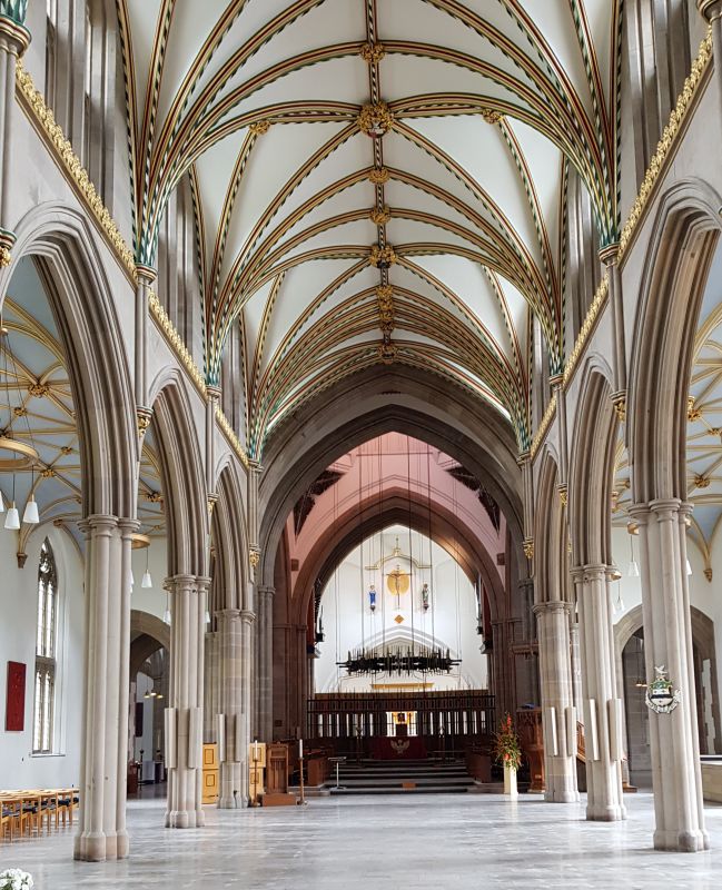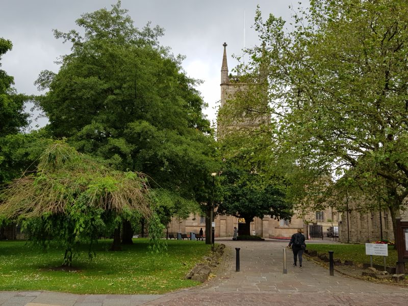 Daneben die Kathedrale der Stadt. Von aussen sieht sie aus wie eine typische englische Kathedrale mit viereckigem Turm.